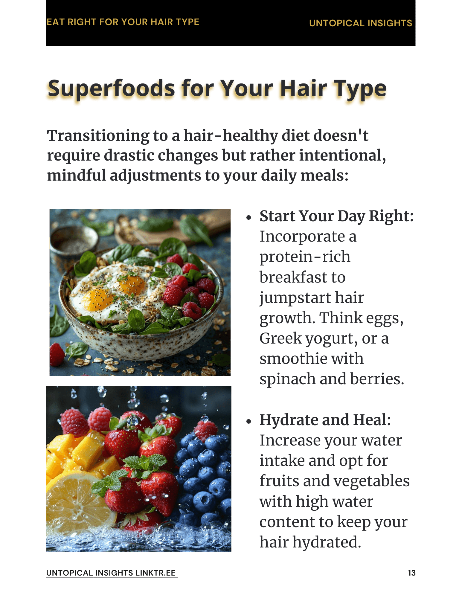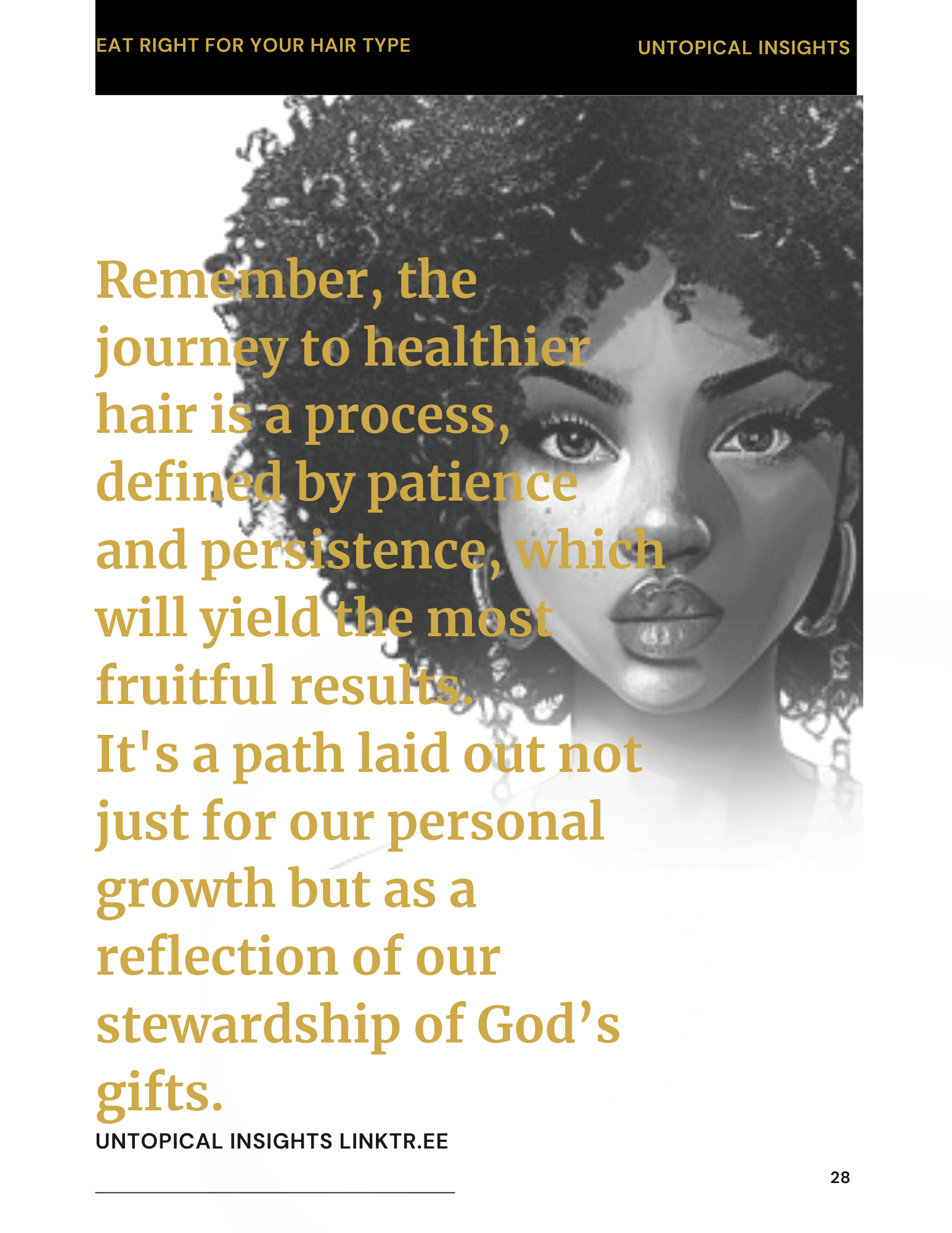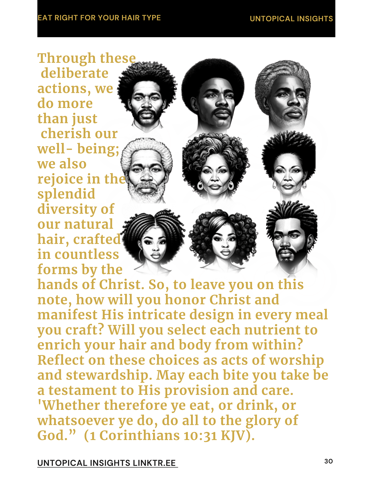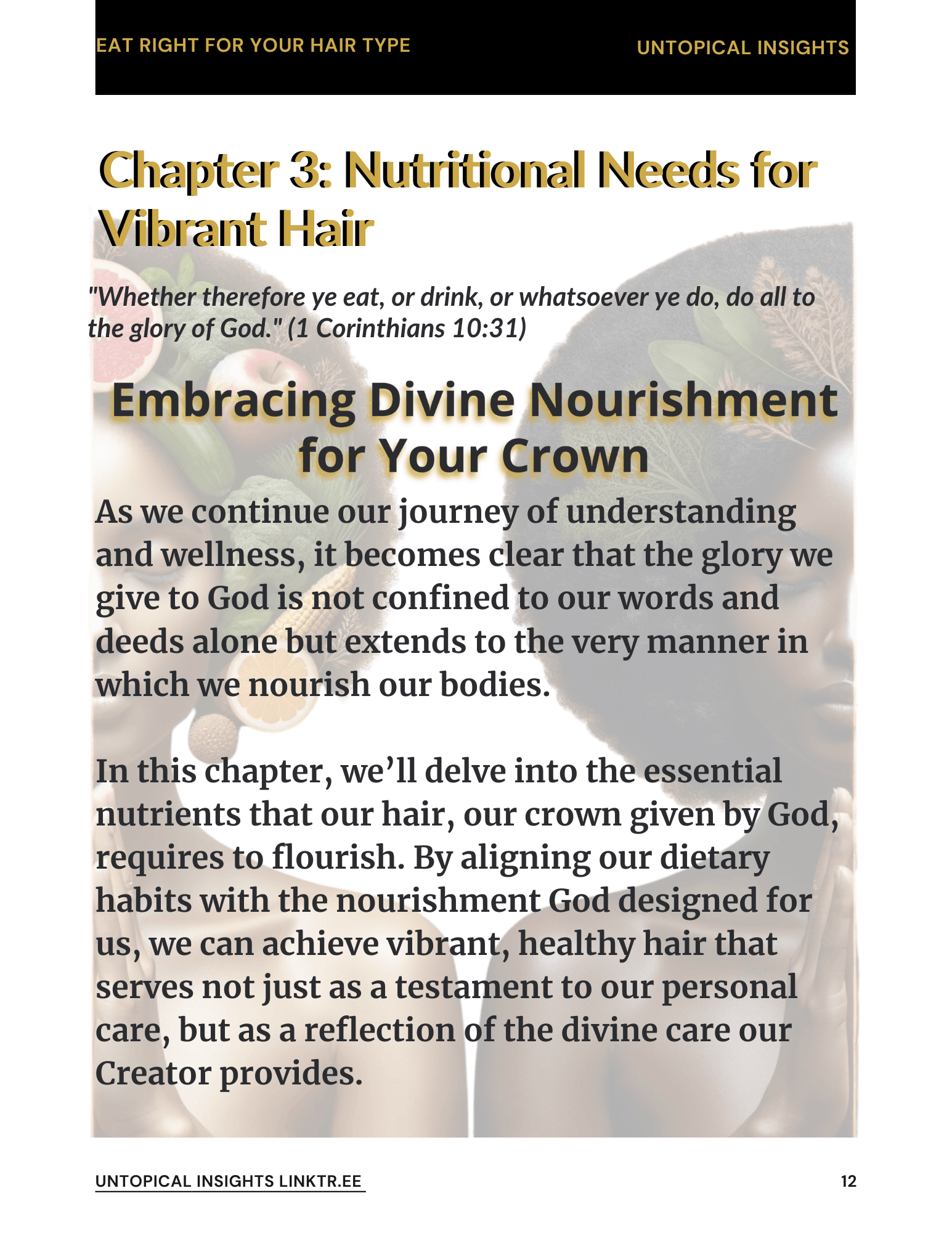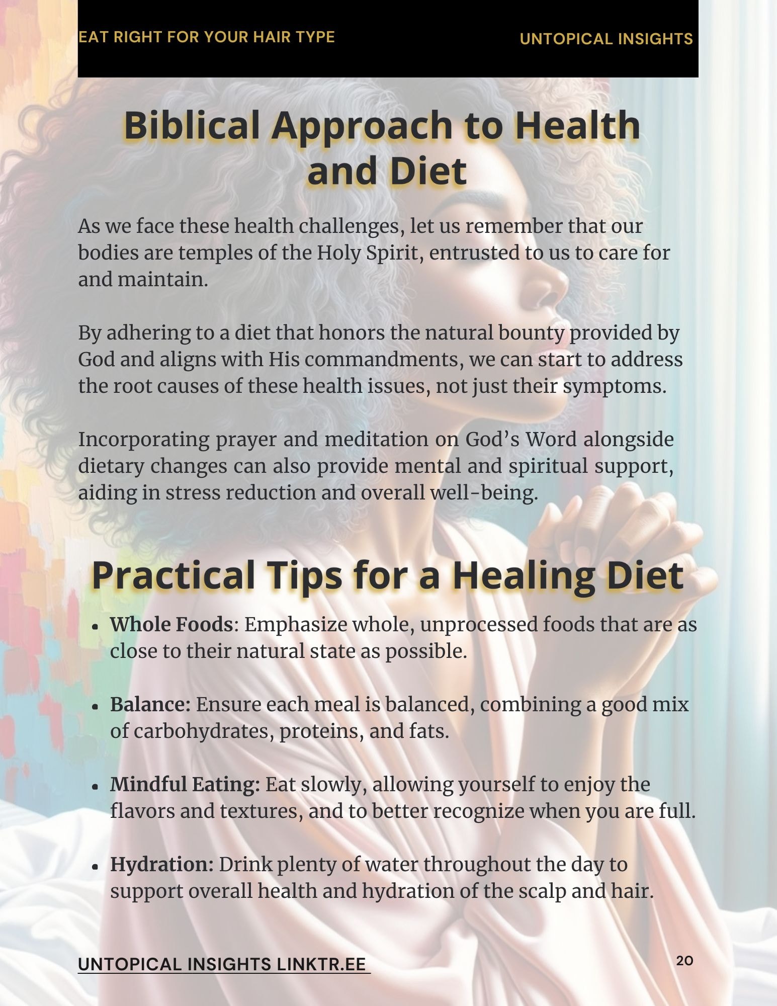 Consider this: you've tried every oil, cream, and serum, yet your hair remains brittle, dry, or slow-growing. The truth is, external treatments can only do so much. Without the right nutrients, your hair struggles to thrive. This eBook offers the missing piece of the puzzle: a guide to eating right for your specific hair type, ensuring that every meal you consume works towards healthier, stronger hair. And with the spiritual wisdom and guidance from the Bible the one true source that can help us greatly, gifted from the Heavenly Father himself. Where can you possibly go wrong?